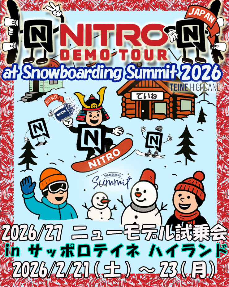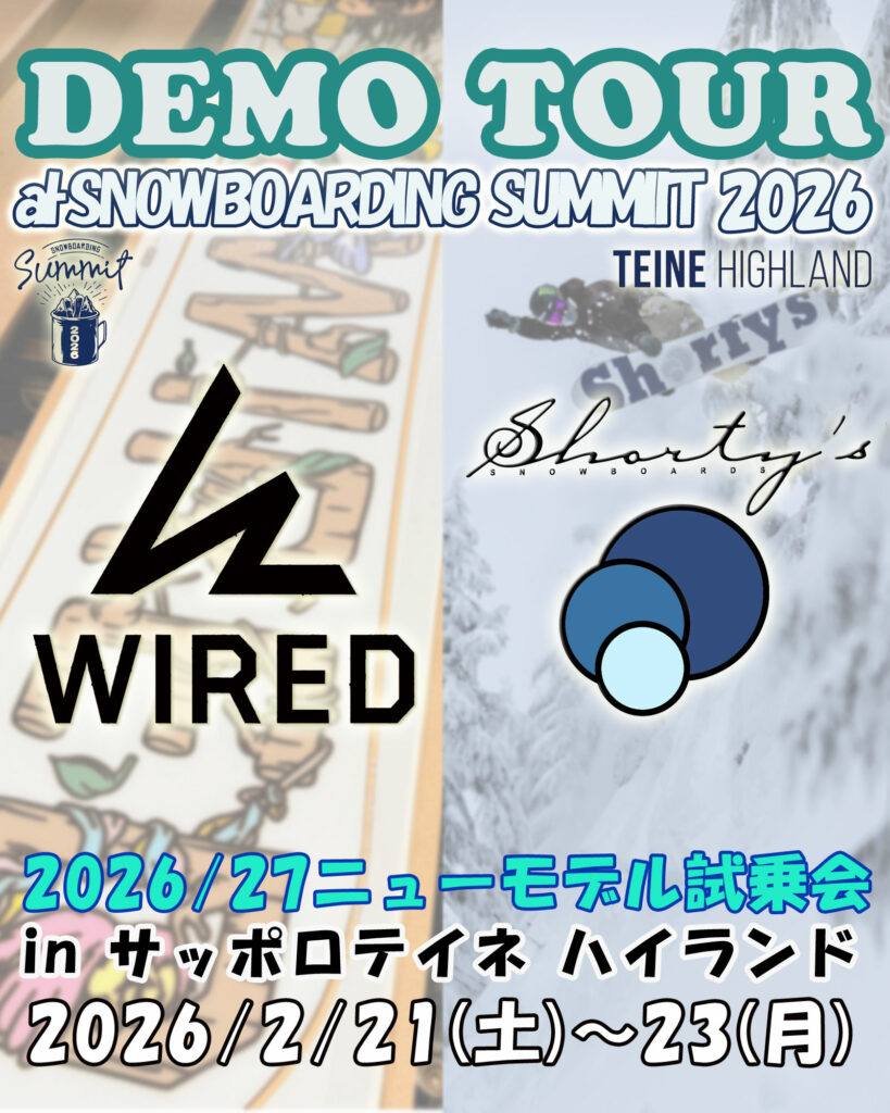 2026年2月21日(土)〜23日(月)にサッポロテイネ ハイランドゾーンで開催される「2025 SNOWBOARDING SUMMIT 北海道 テイネハイランド」にナイトロ / WIRED SNOWBOARDS / SHORTY’S SNOWBOARDS が出展します。